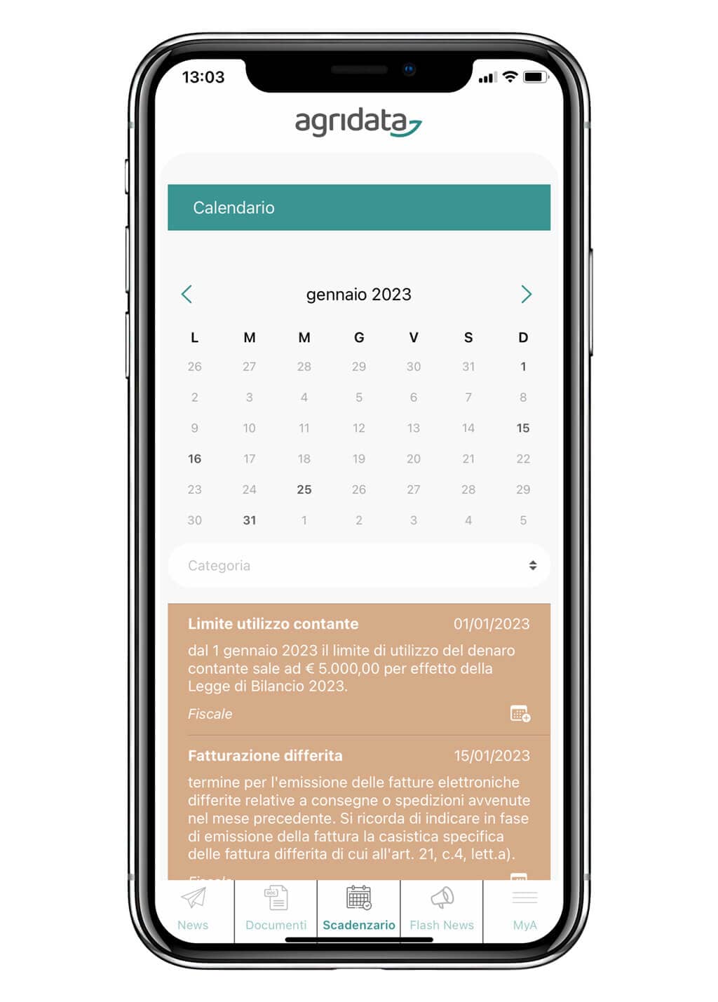 Abbiamo creato l’area riservata MyAgridata per offrirti tutto quello che ti può servire a migliorare la gestione quotidiana della tua azienda agricola. Dallo scadenzario per non perderti neanche una data importante, a uno spazio riservato per tutti i tuoi documenti, fino ad articoli e approfondimenti esclusivi sul mondo agricolo: tutto questo è MyAgridata. Salva gli articoli tra i tuoi preferiti, scegli le categorie più interessanti per te e sfrutta tutte le possibilità di MyAgridata.